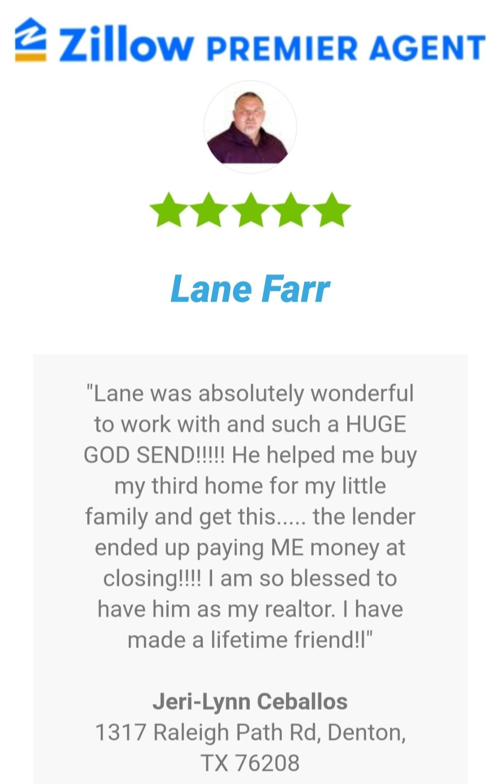 "Lane is so passionate about his career as a realtor and helping people! He went above and beyond to help us find our new home and to sell or old home as well. He has blessed us through the entire process and this new journey. He great people and communication and negation skills. He also saved us thousands of dollars on our listing fees by blessing us with his 1.5% Listing fee!